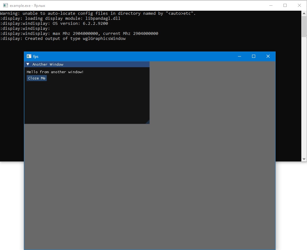 Then I switched to C++, and I managed to draw imgui. I used the official imgui_impl_win32 and imgui_impl_opengl3 backend from the developers for Windows. I guess there’s no problem developing a module for both python (pyd) and C++(lib). It turned out that there are no difficulties in integrating the Im Gui into Panda3D. Here’s the proof.